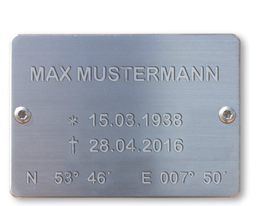 An den acht Stelen können Angehörige auf Wunsch eine persönliche Gedenktafel anbringen lassen. Die Tafeln werden aus hochwertig poliertem und seewasserbeständigem Edelstahl vom Typ V4A gefertigt. Name, Geburts- und Sterbedatum, sowie Beisetzungsposition sind in die Gedenktafeln eingraviert.